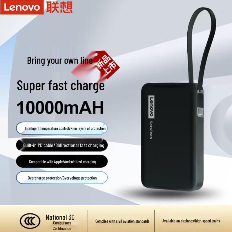 Experience convenient and rapid charging with the Lenovo 10000mAh 22.5W Fast Charging Power Bank. Featuring a built-in cable, this power bank supports Type-C two-way fast charging, ensuring quick power delivery for both Apple and Android smartphones. Its compact design (109.6mm x 67.5mm x 19mm, 0.2kg) makes it ideal for on-the-go use, office, or trendy desk setups. Comes in a sleek black finish.