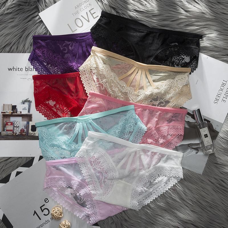 Ladies Spring and Summer Sexy Lace Hollow Breathable Low Waist Cotton Crotch Triangle Briefs