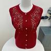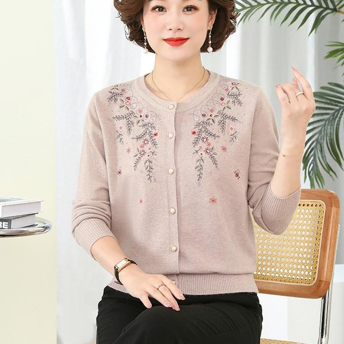 Women's Crew Neck Wool Cardigan Autumn/Winter Loose Fit with Rhinestone Embroidery Knit Cardigan Top