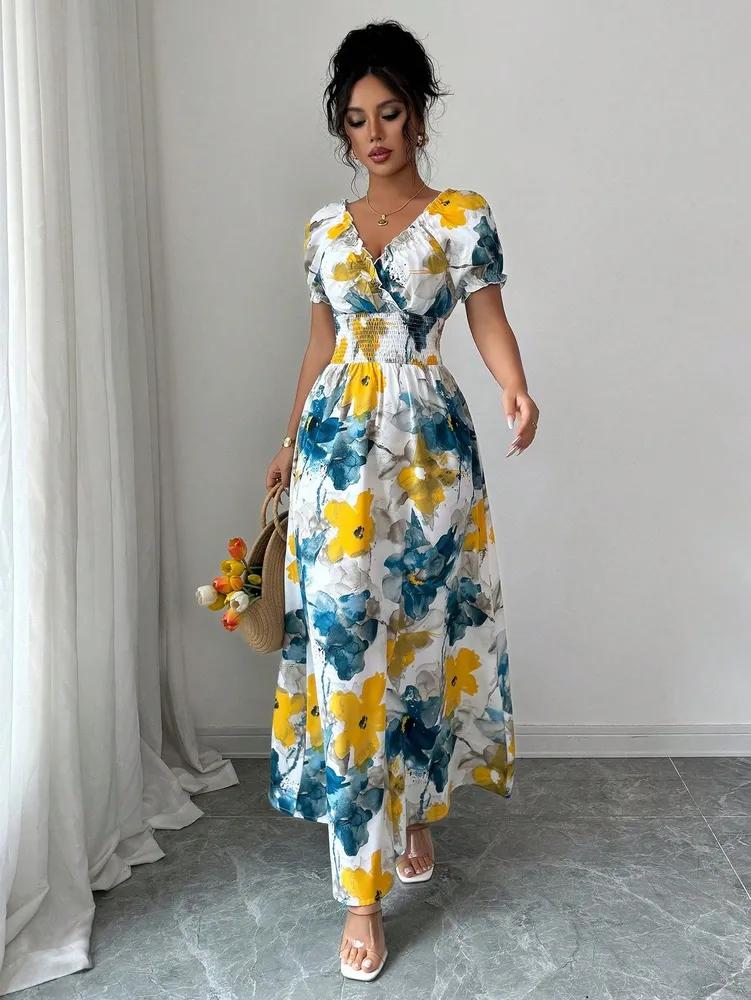Women's Short-sleeved Tie-waist Dress, Printed V-neck Long Dress