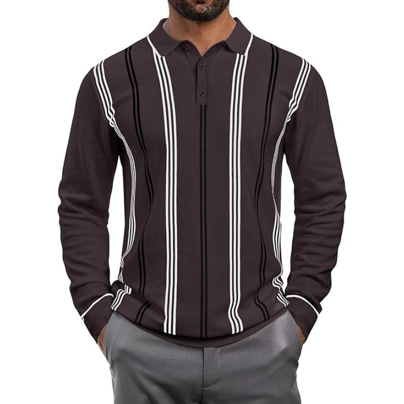 Pánské golfové tričko s dlouhým rukávem, vhodné pro volný čas, základní pruhované polo tričko s knoflíčkem u krku