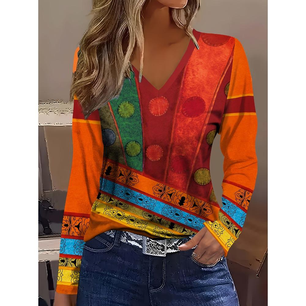 Stylish and elegant ethnic retro color block stitching graphic transfer printing V-neck T-shirt