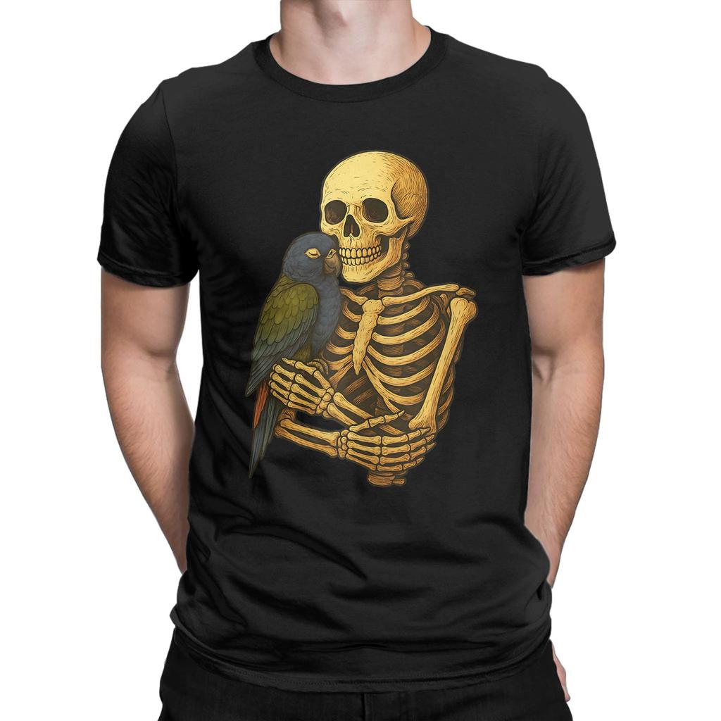 Skeleton Hugging Pionus Parrot Funny Halloween T-Shirt Men Vintage Cotton Tees O Neck Short Sleeve T Shirts Plus Size Clothes