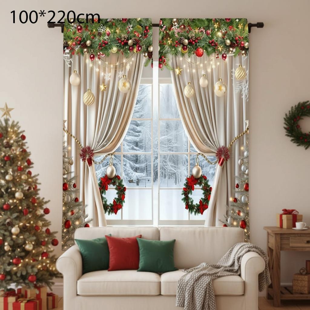 2pcs Xmas Ornament Holly Curtains Light Filtering Decor Polyester Xmas Holiday Window Home Living Bedroom Rod Pocket
