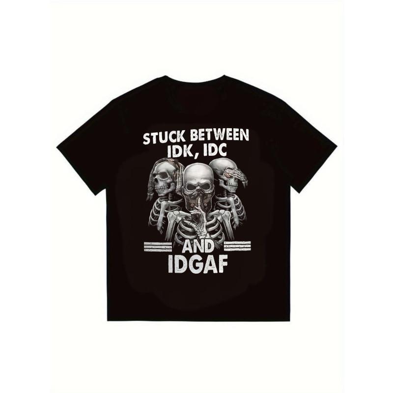 Black T Shirt With Skeleton Graphic And Stuck Between IDK IDC And IDGAF Text For Casual Streetwear Fashion