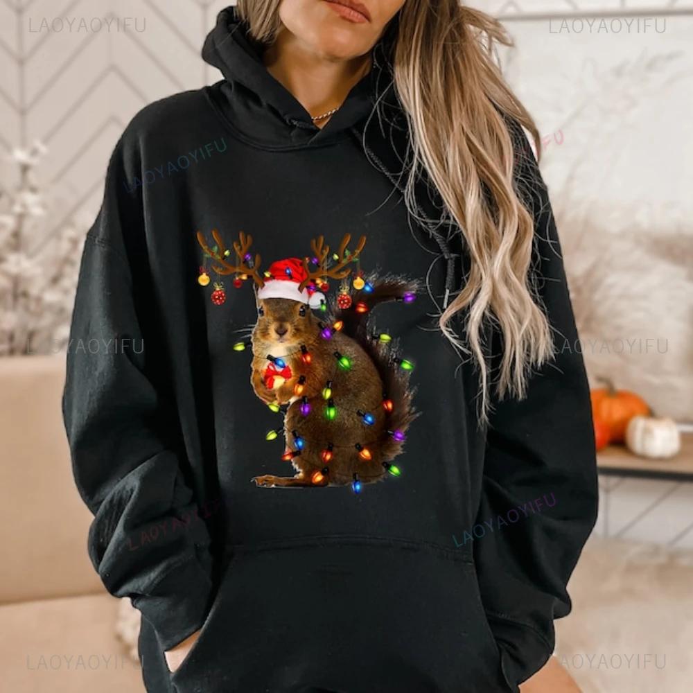 Christmas Squirrel Lights Sweatshirt Xmas Squirrel Hoodie Women Long Seleeve Sweater Santa Squirrel Gift Cute Christmas Sweater