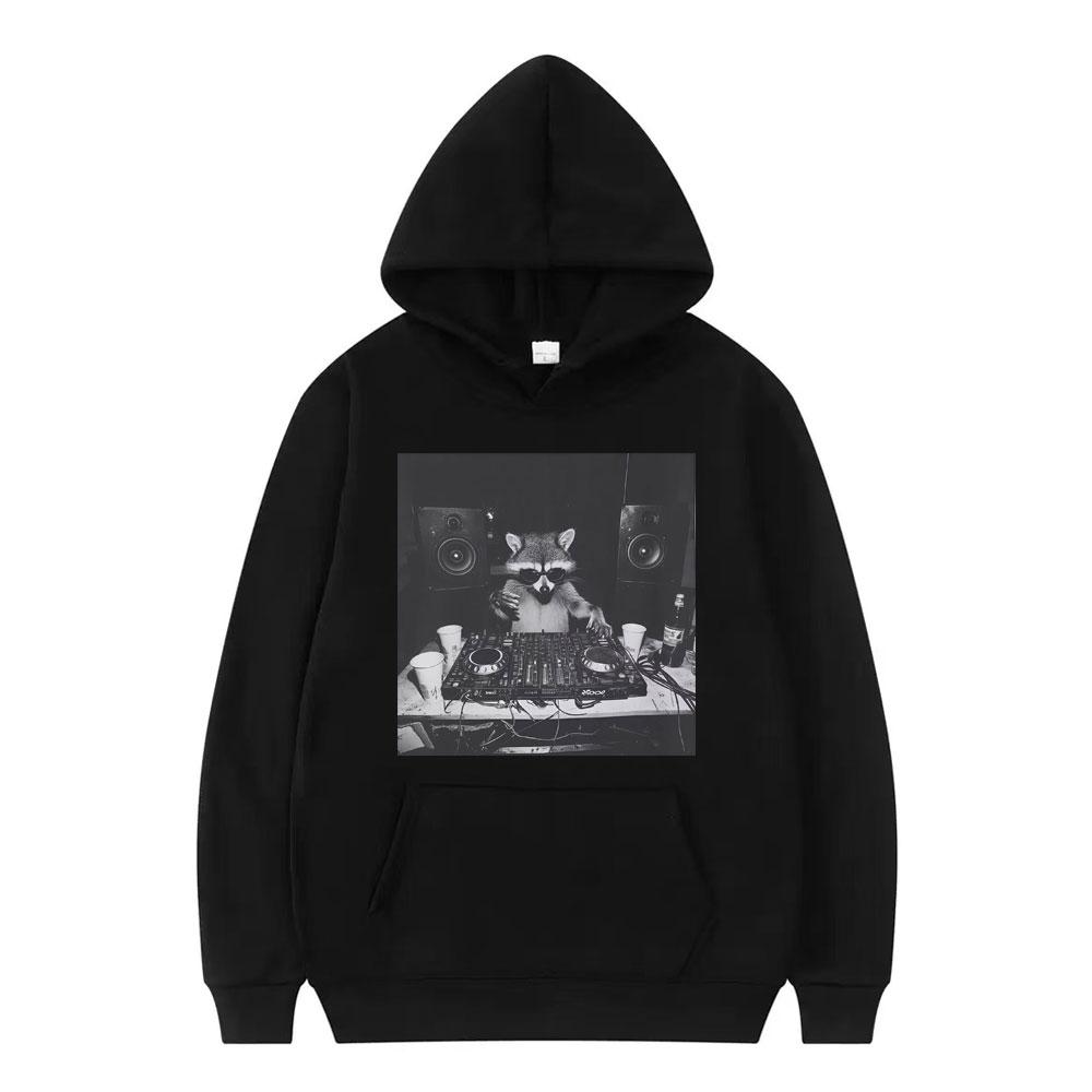 Funny Raccoon DJ Animals Meme Graphic Vintage Hoodie Men Women Pullover Long-sleeved Fashion Harajuku Sweatshirt Streetwear Top
