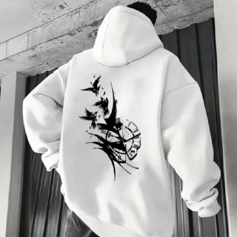 Retro Clock Raven Print Hoodie Autumn Winter Daily Casual Sport Hooded Sweatshirt Male Fashion Pullover Streetwear Oversize Coat