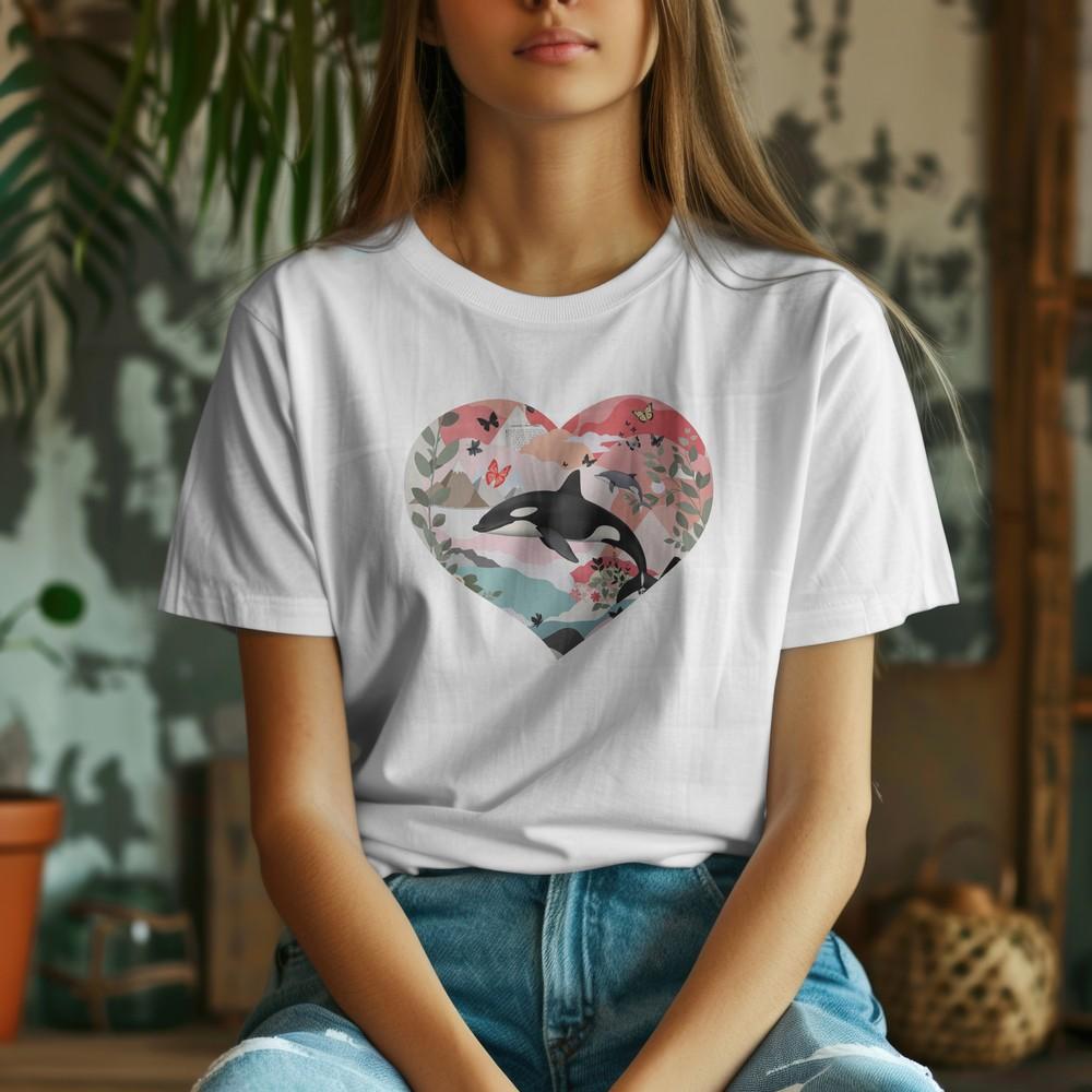 Killer Whale And Dolphins In Love Heart T-shirt, Marine And Floral Collage Tee