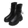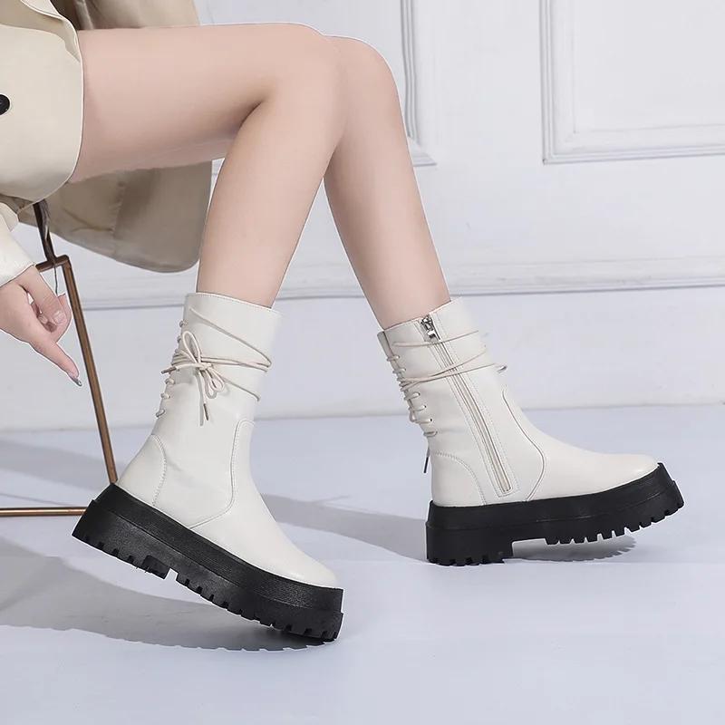 Women Boots New Leather Thick-soled 6 Boots Women's Short Boots Side Zipper Rider Boots Back Lace Mid-tube Boots