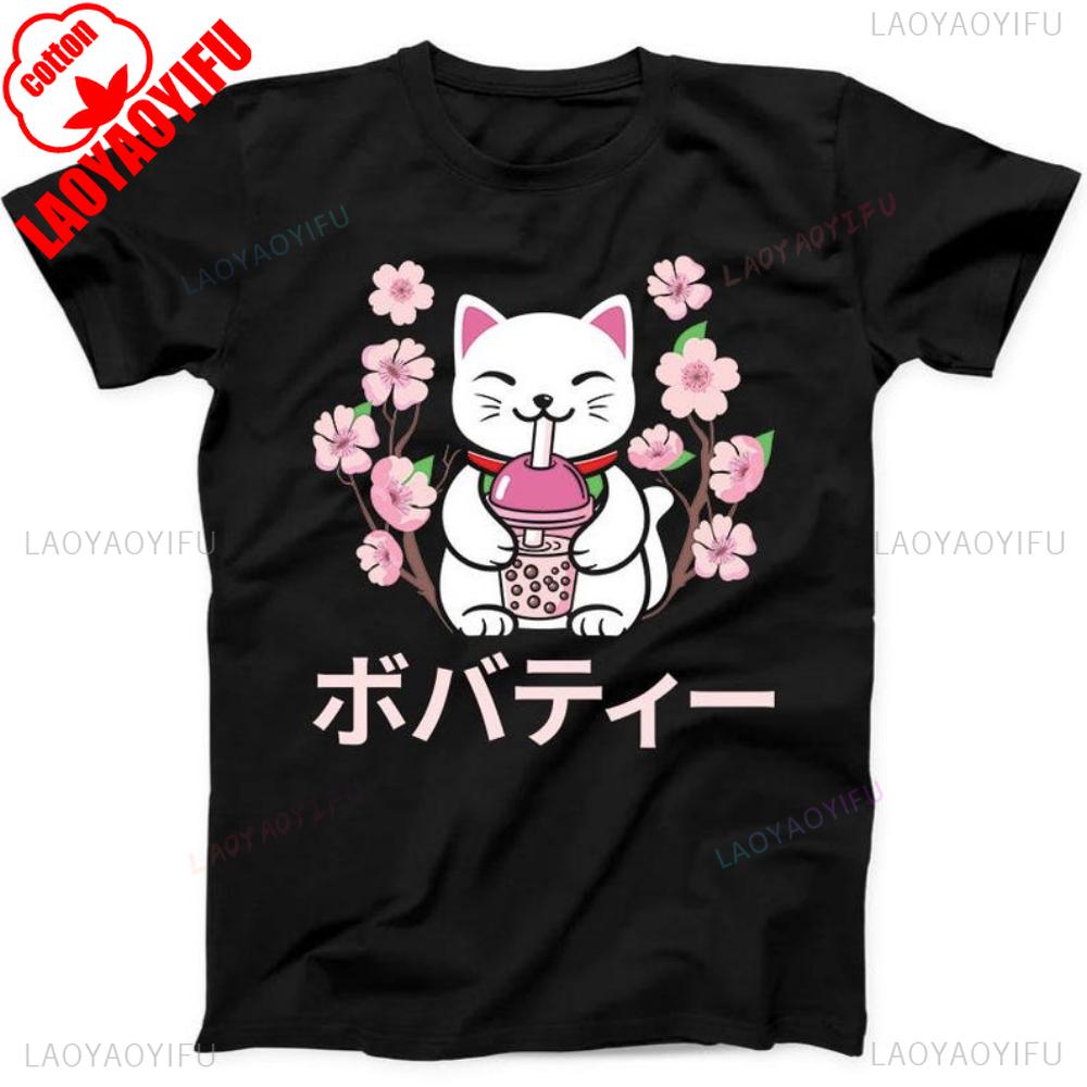 Maneki Neko Boba Bubble Tea Sakura Lucky Cat Funny Gift Tee Black T Shirt for Fitness Training Jogging Outdoor Activities