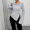 Women's Fashionable Casual Long-Sleeved Solid Color Irregular Hem Flared Sleeves Drawstring Design Slim Fit Pullover Round Neck T-Shirt Top