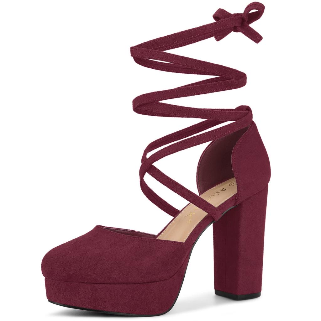 Allegra K Women's Lace-Up Pumps Sandals with Platform Straps and Chunky Heels, Wine Red, Size 23.0cm