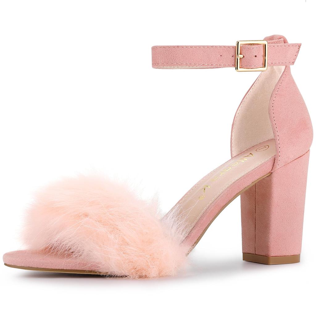 Allegra K Women's Pink Faux Fur Block Heel Ankle Strap Sandals, Size 27.0cm