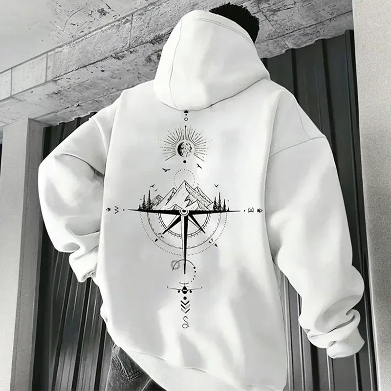 Vintage Compass Print Hoodies for Men High Quality Hooded Long Sleeve Pullover All Season Daily Casual Sports Tops Men's Clothes