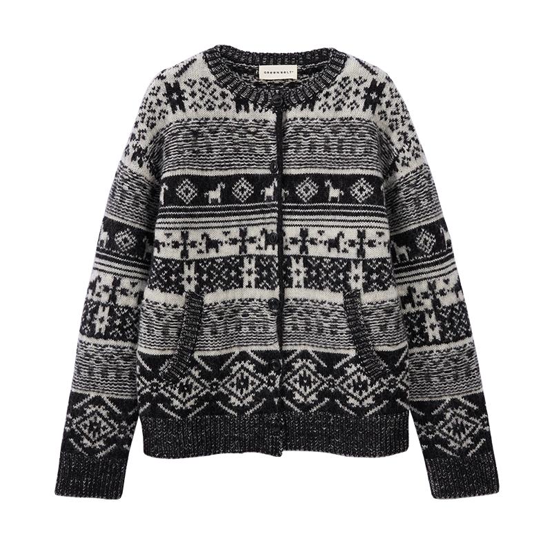 GREEN BELT Women's Retro Fair Isle Pure Wool Cardigan