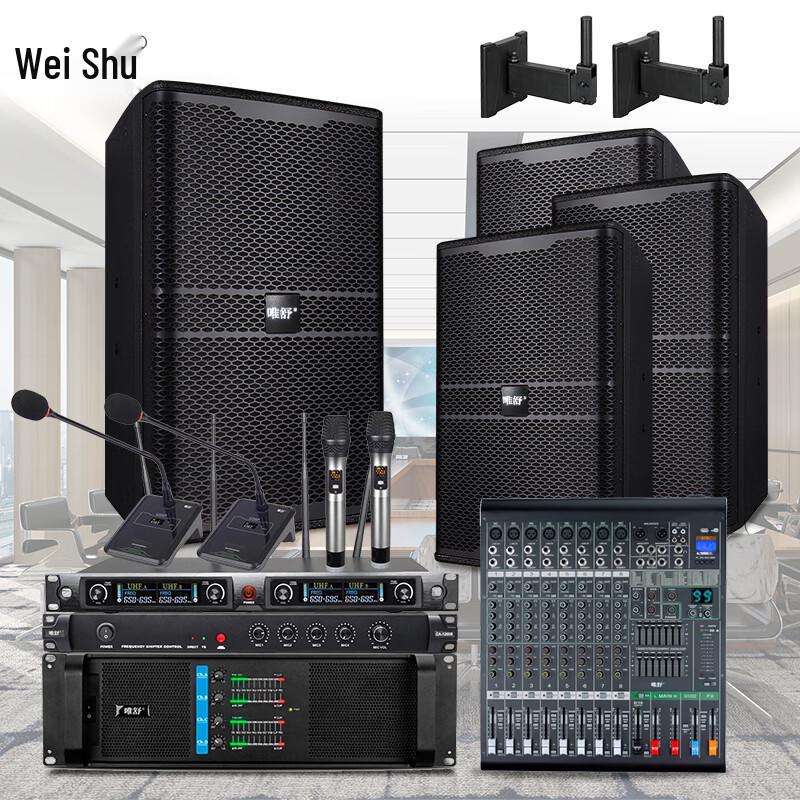 The Weishu PC-610 is a comprehensive professional audio system designed for various demanding environments such as conferences, cinemas, and bars. This versatile set includes 10-inch full-range speakers, a pure power amplifier, a mixing console, a microphone, and a feedback suppressor, providing a complete audio solution. Crafted from durable wood, this passive speaker system ensures robust sound delivery for an immersive experience. It features power supply operation and requires external amplification.