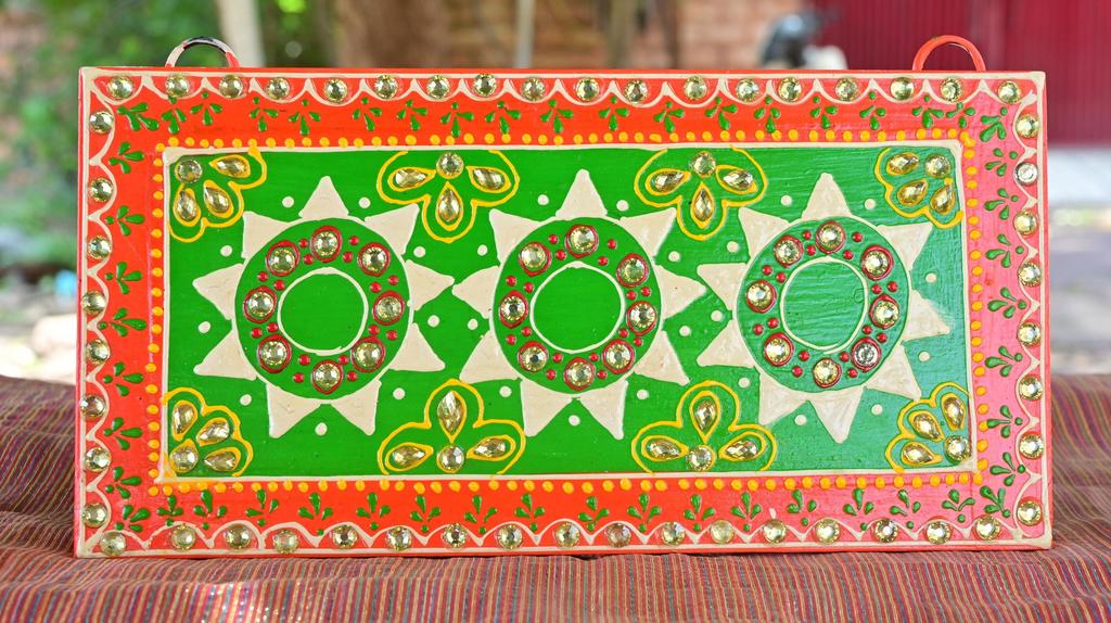 Celebrate the beauty of traditional Indian craftsmanship with this hand-painted wooden decorative panel, a true piece of folk artistry that brings color, culture, and charm to your home.