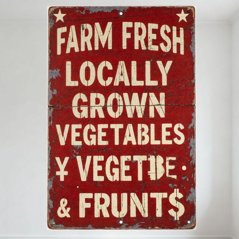 Vintage Farm Fresh Locally Grown Vegetables & Fruits Distressed Tin Sign with Stars, Holes for Hanging - Rustic Antique Produce
