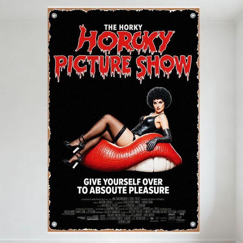 Vintage The Horcky Picture Show Metal Tin Sign, Rocky Horror Parody with Seductive Woman, Campy Theatre Decor for Man Cave Bar C