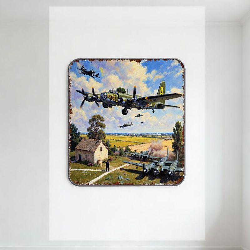 Vintage vojenská scéna z 2. světové války Kovový plechový znak - Bombardéry 2. světové války v letce, Kamenný dům, Rustikální vzhled pro domácí bar Muž C