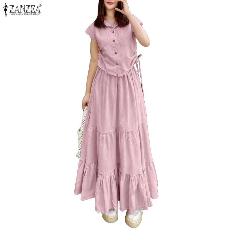 ZANZEA Women Summer Short Sleeve Blouse and Long Skirts Casual Two Piece Suit Sets