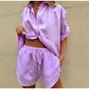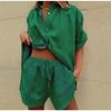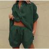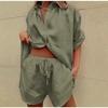 Summer Women Fashion Two Piece Set Casual Loose Button Tops with Drawstring Shorts Solid Color Home Suits Short Sleeve Outfit