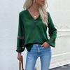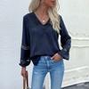 Women's Spring and Autumn Long Sleeved Shirt with Patchwork Lace Pullover, Women's V-neck Hollow Out Shirt