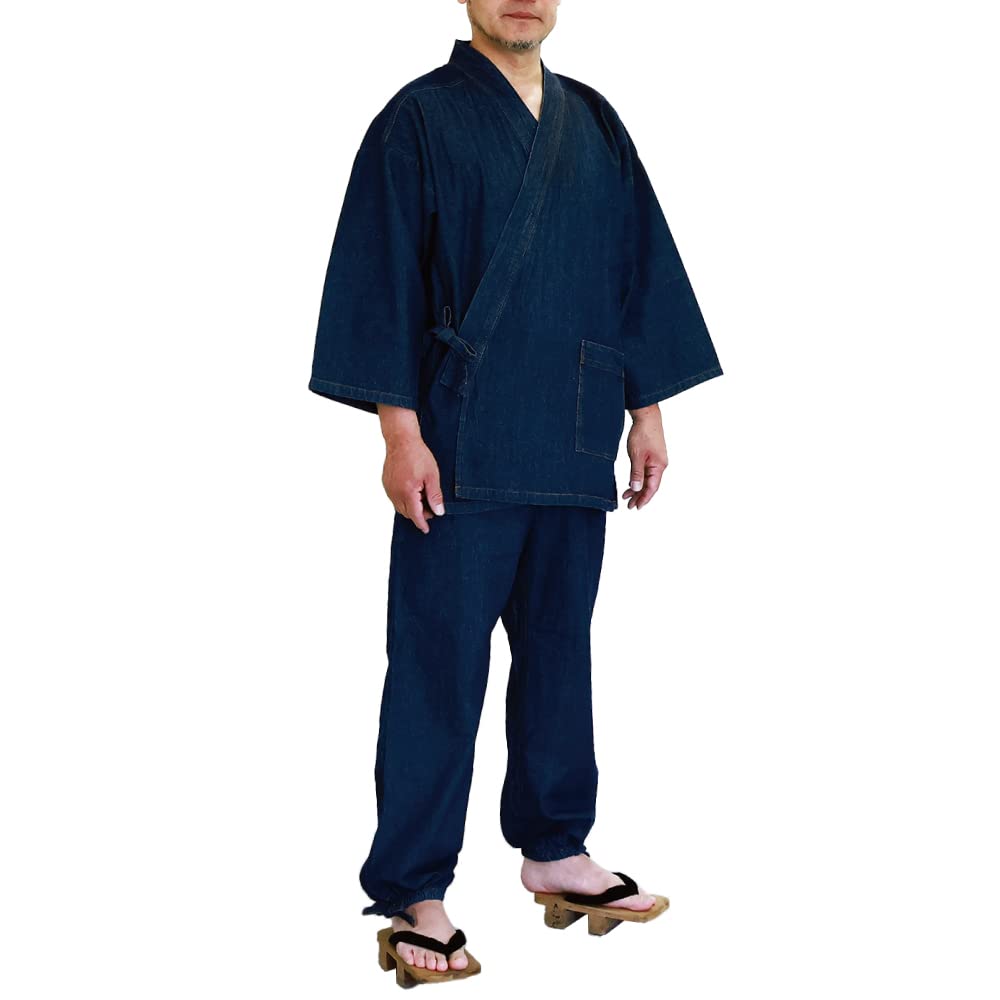SWINGPLUS Men's Denim Kimono Samue Set (Top and Bottoms), Loungewear, Sizes M-2L (2L, Indigo)