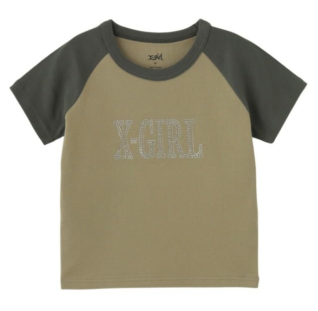 X-girl Rhinestone Roman Type Logo Raglan Short Sleeve Baby Tee, 105252011029, Beige, Small