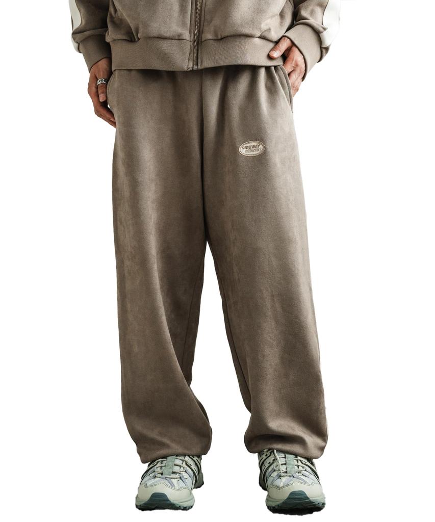 SIDEWAY STANCE striped track pants featuring an embroidered oval logo. ●Crafted from suede ponte with a soft, brushed texture reminiscent of peach skin. ●A relaxed, on-trend fit that reflects the street scene. ●Easy-fitting pants with a drawcord elastic waist and a drawcord at the hem. ●Available in black, beige, and a subdued blue for versatile coordination. ●The subtle oval logo is the key to the design. From classic character designs to tagging-style illustrations, graffiti logos, and homage designs, the playful, eye-catching designs are the secret to their popularity each season. The cute, original embroidery adds a touch of understated style. Recommended for street, skater, and Korean fashion, this pair also pairs with a track jacket made of the same material. A look that's perfect for both men and women with a masculine flair.