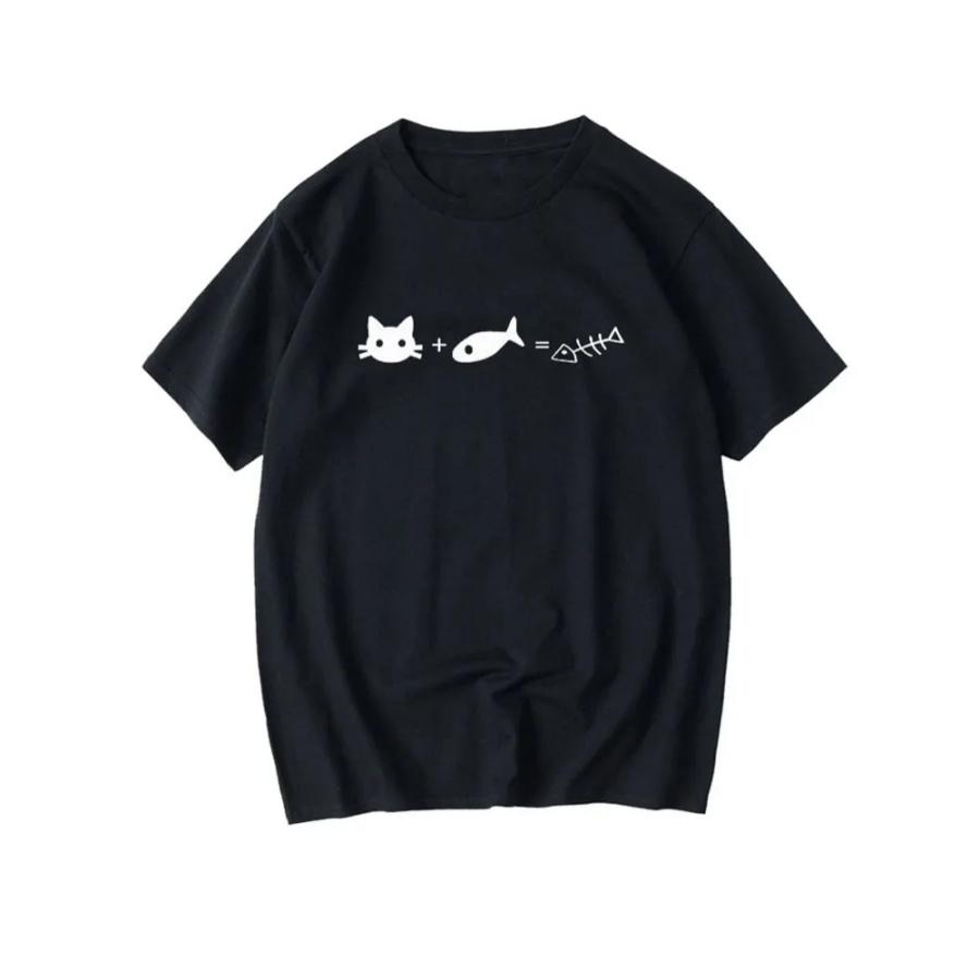 Summer Cat and Fish Math Formula Print Printed T-Shirts Loose Round Neck Short Sleeve Relaxed Styles Comfortable Women‘s Tops