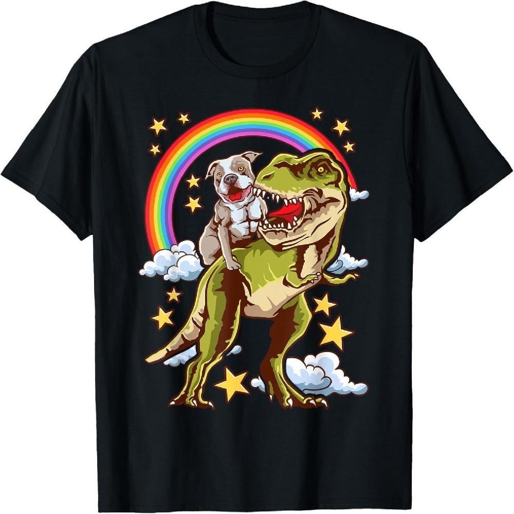 Funny Pitbull Riding A Dinosaur Rainbow illustration fun T-Shirt