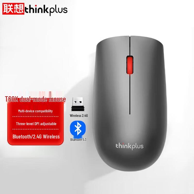 The Lenovo ThinkPlus T60X is a lightweight, portable dual-mode mouse featuring both 2.4G wireless and Bluetooth 5.3 connectivity. Designed for business and office use, it boasts a classic red dot, skin-friendly material, and a symmetrical design suitable for medium hands. It is powered by dry batteries and compatible with Windows.