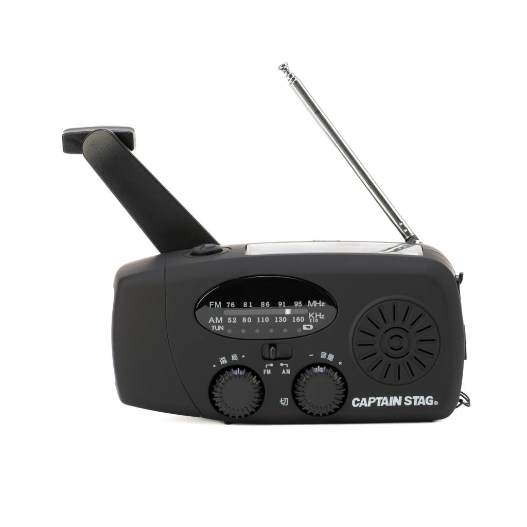 Features: LED light, mobile battery function, FM/AM radio, hand-crank dynamo, solar panel