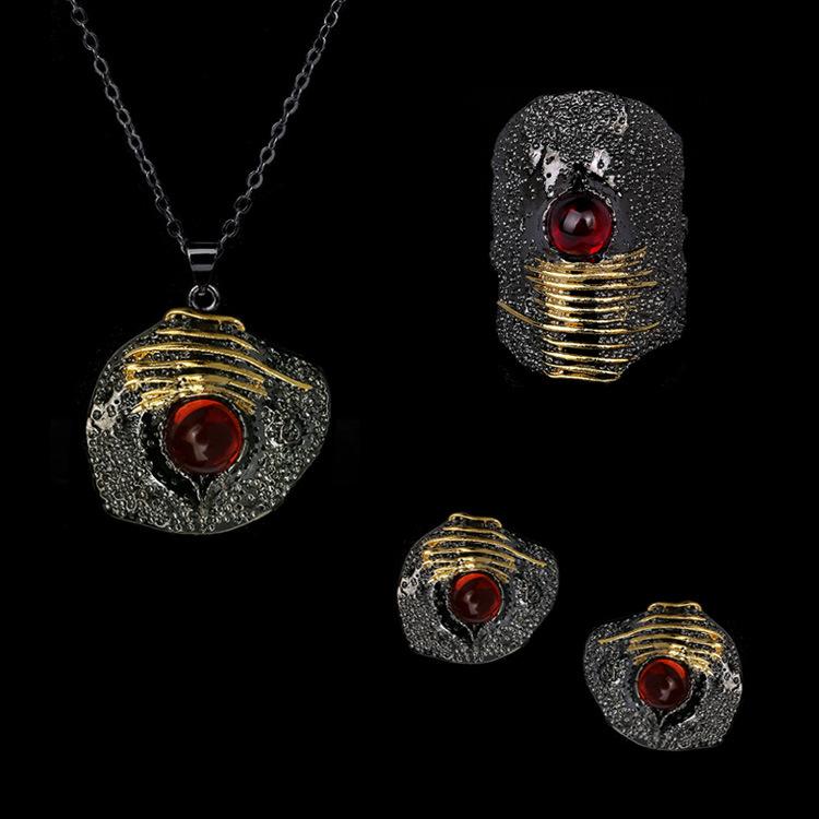 Unique Irregular Inlaid Ruby Black Gold Two-tone Ring Necklace Earrings Black and Gold Two-tone Three-piece Set Women Jewelry
