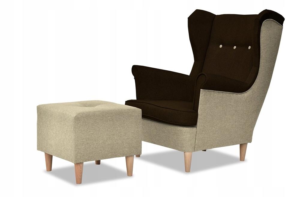 Fotel Uszak DUO w stylu skandynawskim z podnóżkiem - połączenie brązu oraz beżu. Aukcja dotyczy fotela Z PODNÓŻKIEM. Zapraszamy do zapoznania się z ofertą. Fotel Uszak DUO z podnóżkiem model SW 26/24 oparcie profilowane boczki, siedzisko oraz tył ozdobione żyłką.