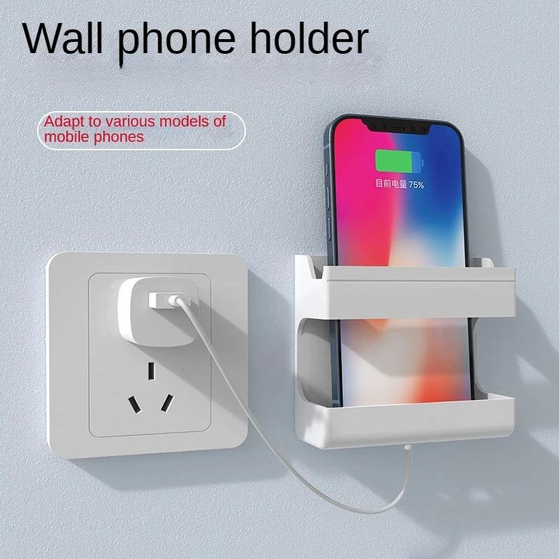 Wall Mount Phone Holder White Punch Free Wall Mobile Phones Charging Stand Lazy Sticky Remote Control Storage Box