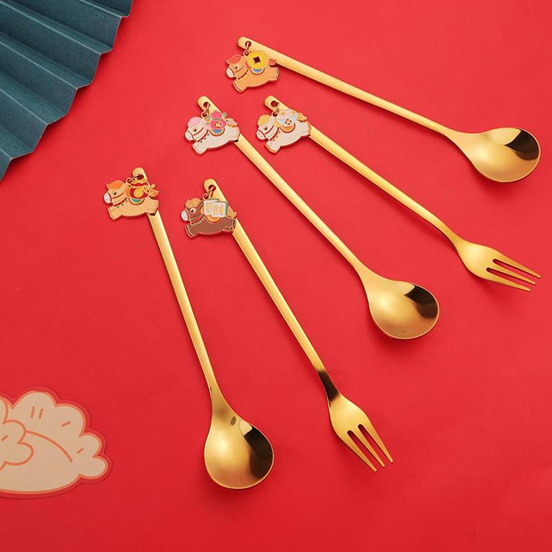 Year Of The Horse Chopsticks Spoons Set Gold Chinese Year Stainless Steel Spoon Dessert Forks Decoration For Tableware