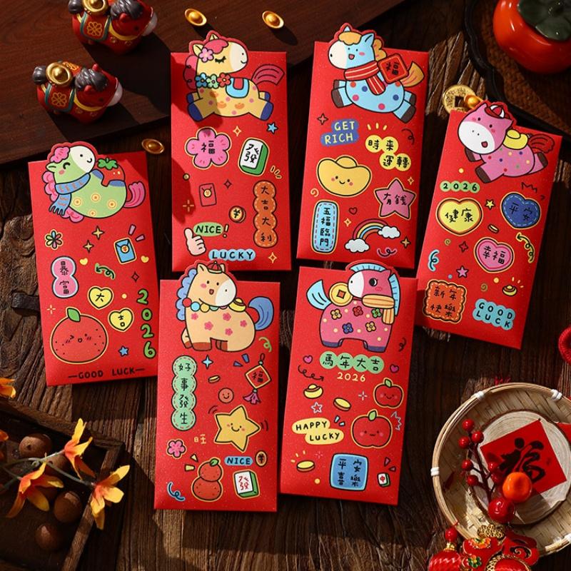 6Pcs 2026 Horse Year Cartoon Zodiac Horse Patten Lucky Red Envelope Creative Spring Festival Gift Money Envelopes Red Packet