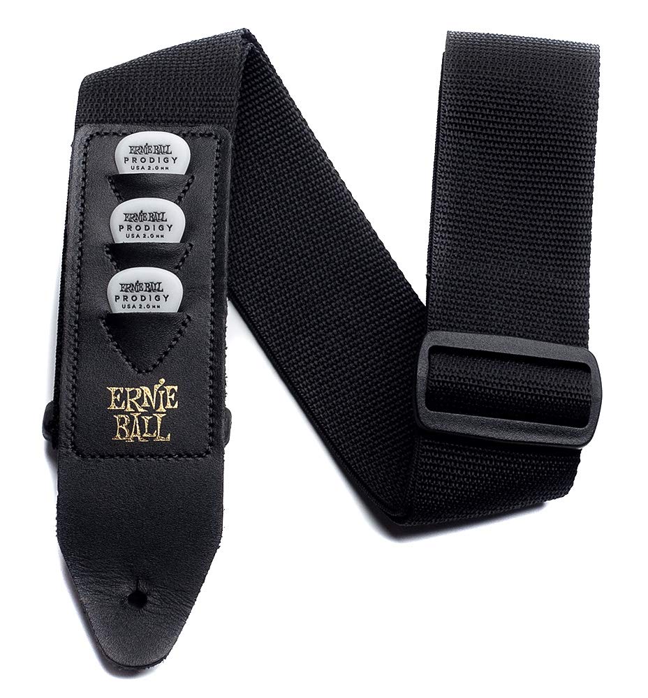 Nylon strap. Features: Three guitar picks can be placed on the bottom front end of the strap.