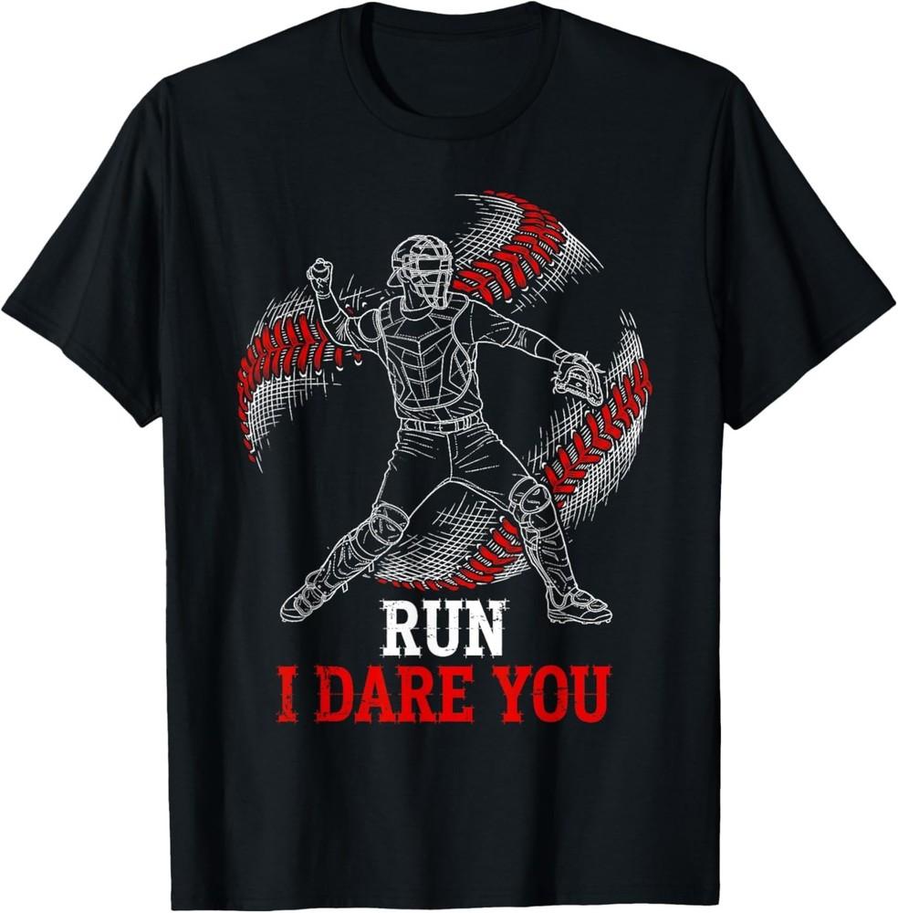Run I Dare You Funny Baseball Catcher Graphic Players Fans T-Shirt