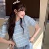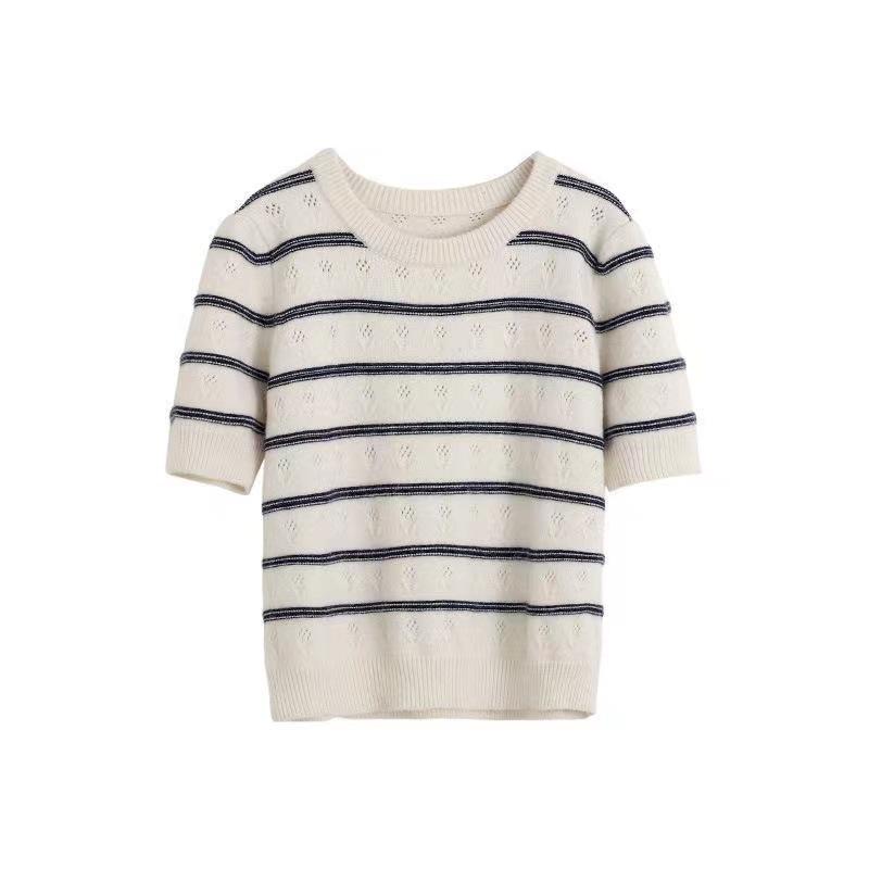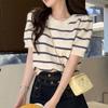 Pruhovaný dutý bavlněný svetr s kulatým výstřihem a krátkým rukávem pro ženy v létě Nový kontrastní barvy Volný a všestranný krátký top