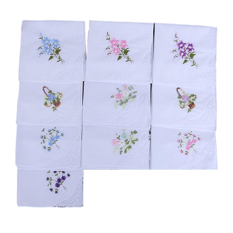 10pcs Soft Cotton Handkerchief Embroidered Flower Women Delicate Handkerchiefs for Daily Use