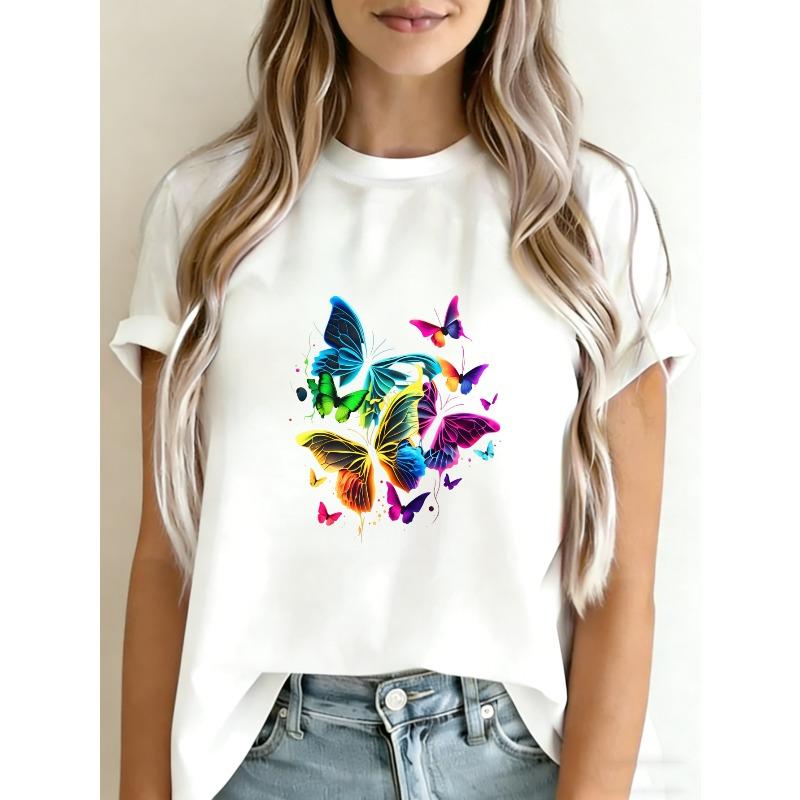 Butterfly Print T Shirt White Colorful Butterflies Pattern Casual Wear For Women Summer Outfit Fashion Top