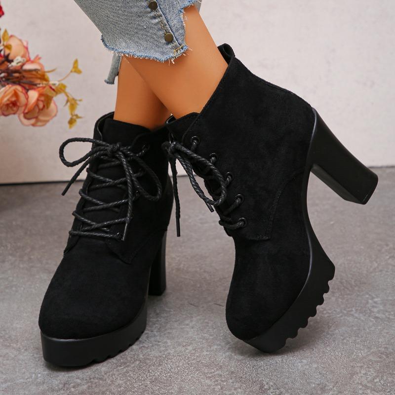 Block Heel Booties Women's Fall/Winter Round Toe Lace-up Suede Skinny Platform Heels