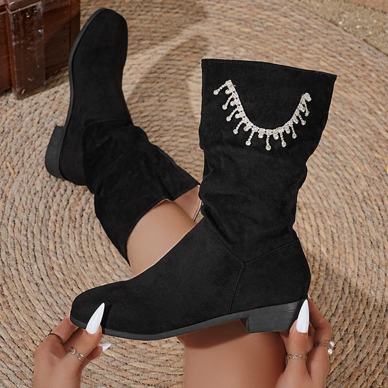 Suede Stack Boots Women's Round Toe Sleeve Rhinestone Soft Slip Anti-Wear Mid-Cylinder Boots