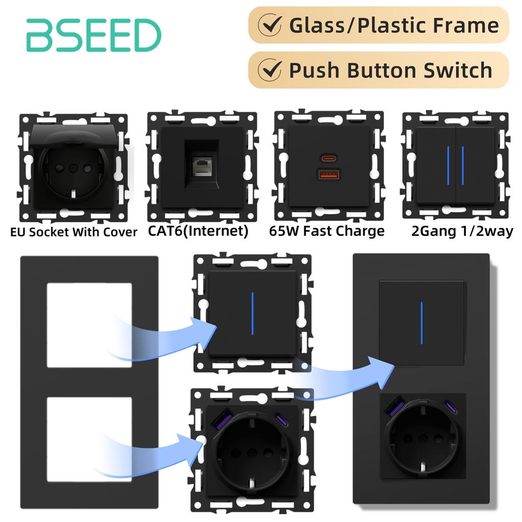 BSEED Switch DIY Modules Light Switch Parts Black Glass/Plastic Frame DIY Combination Wall Sockets TV CAT6 USB-C Charge Key