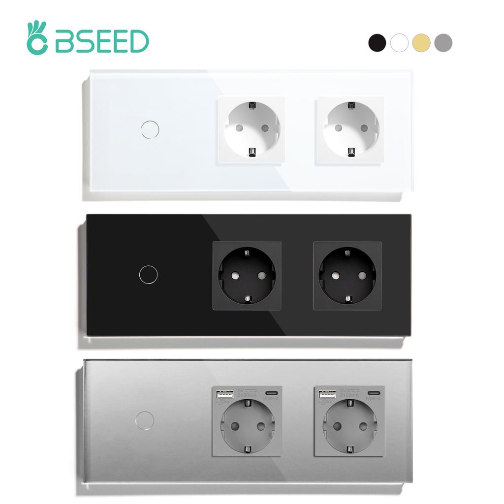 BSEED Touch Sensor Switch 1/2/3Gang 1Way Wall Light Switches Crystal Glass Switch With Double Power Sockets EU Standard