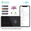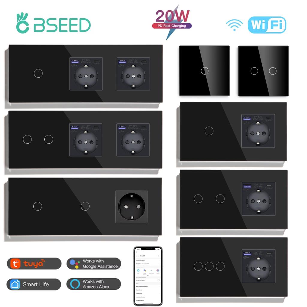 BSEED Wifi 1/2/3Gang Wall Light Switches Touch Panels Tuya Smart Life App Control With EU Power Sockets 20W USBC Charging Ports